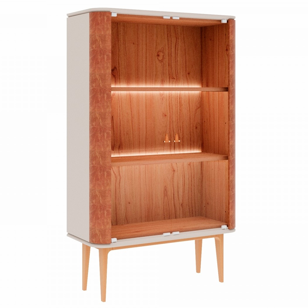 Detalhe curvo e puxadores com revestimento sintético Caixaria interna em laminado cinamomo Prateleiras com iluminação