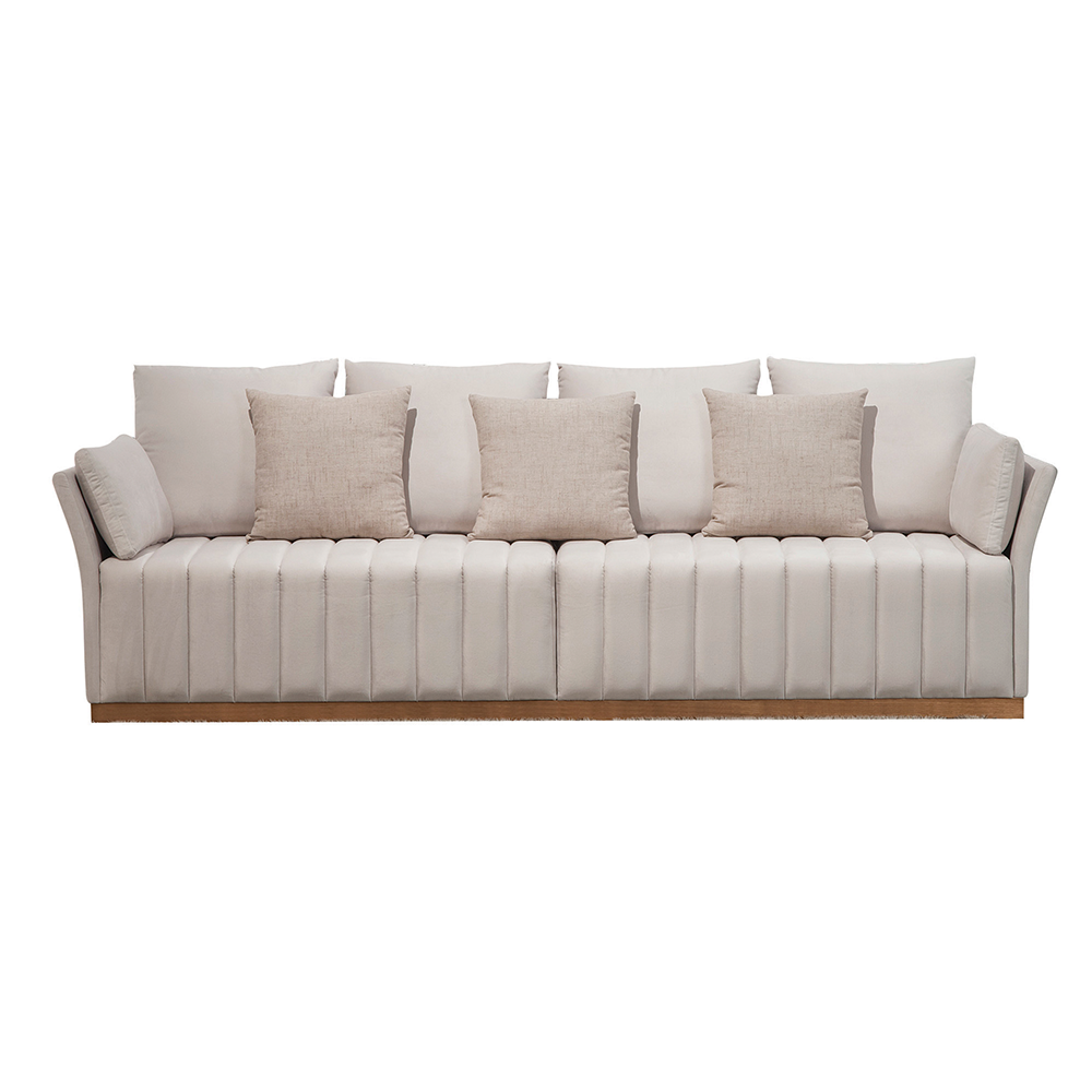 Sofá fixo com braços finos e base em madeira, destacando-se pela costura moderna no assento e almofadas soltas. Um toque de sofisticação e contemporaneidade para sua sala.